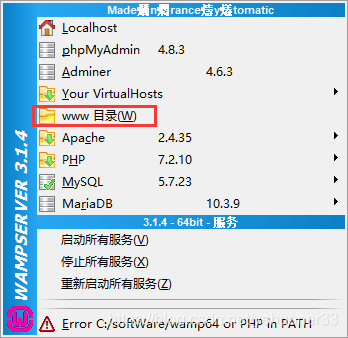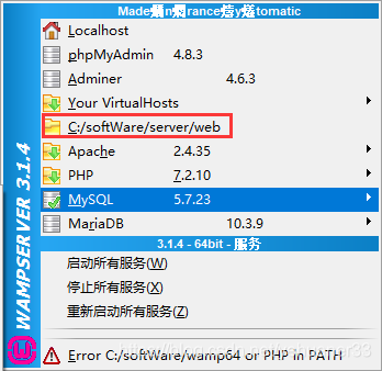 最后重启wampserver软件,注意是重启软件,不是重启所有服务,重启之后点击绿色图标就可以看到如下图: