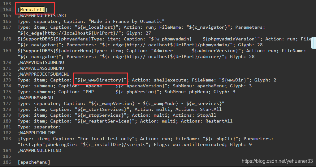 此时并没有修改成功,因为我们用的是wampserver的集成环境,所以还需要修改wampserver的配置文件,打开wampserver安装文件中的wampmanager.ini文件,找到下图中的地方: