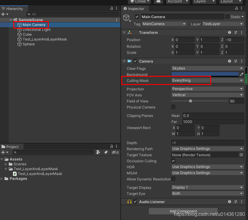 1、开始 Main Camera 的 CullingMask 为 Everything