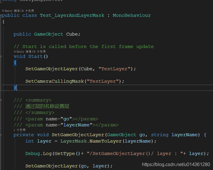 {public GameObject Cube;// Start is called before the first frame updatevoid Start(){SetGameObjectLayer(Cube, "TestLayer");SetCameraCullingMask("TestLayer");}/// /// 通过层的名称设置层/// /// /// private void SetGameObjectLayer(GameObject go, string layerName) {int layer = LayerMask.NameToLayer(layerName);Debug.Log(GetType()+ "/SetGameObjectLayer()/ layer : "+ layer);SetGameObjectLayer(go, layer);}/// /// 通过层的序号设置层/// /// /// private void SetGameObjectLayer(GameObject go, int layer) {go.layer = layer;}/// /// 通过层的名称设置 Camera CullingMask/// /// private void SetCameraCullingMask(string layerName) {int layer = LayerMask.NameToLayer(layerName);SetCameraCullingMask(layer);}/// /// 通过层的序号设置 Camera CullingMask/// /// private void SetCameraCullingMask(int layer){Camera.main.cullingMask = 1 << layer;}