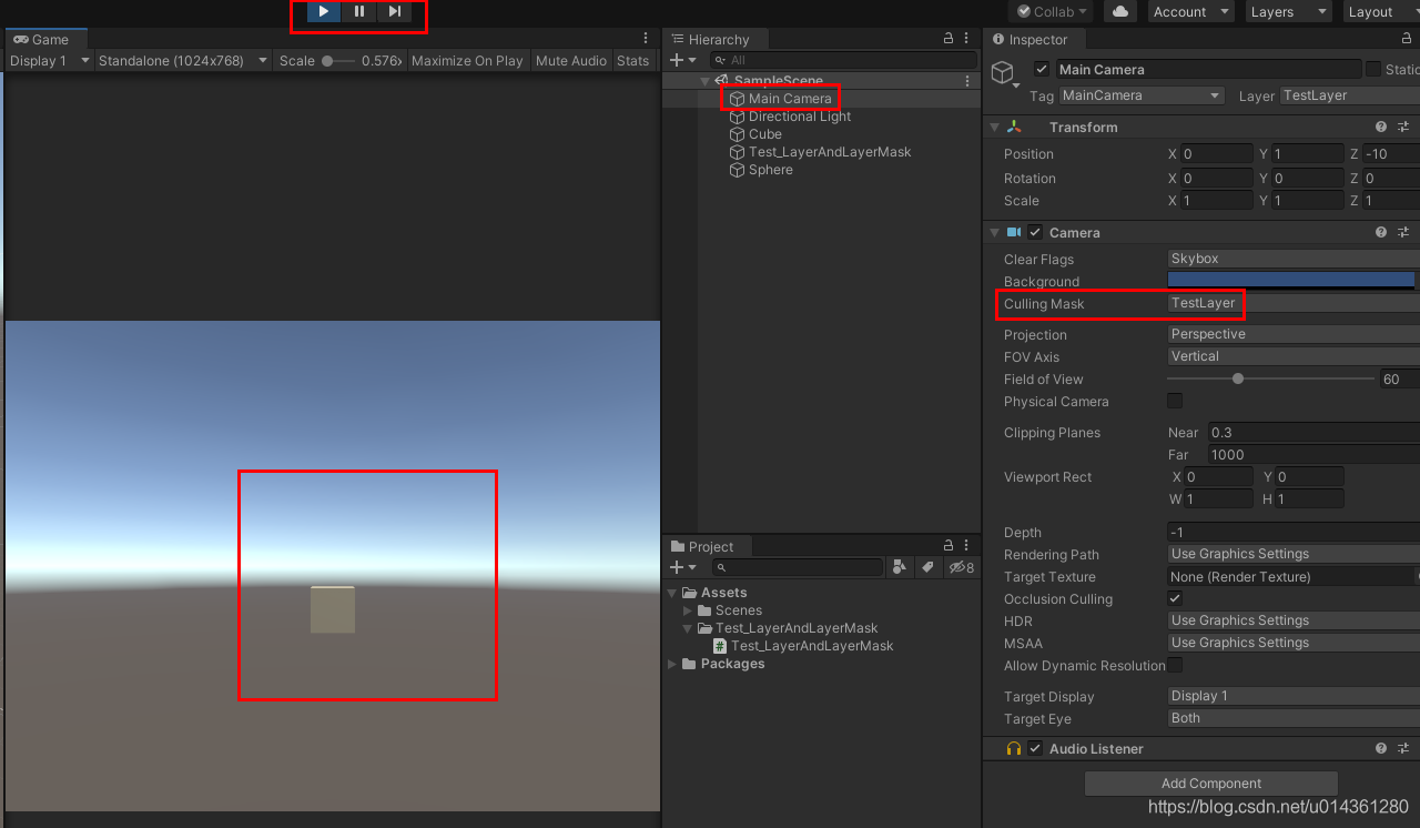 2、编写脚本,设置 Cube 的 Layer 和 Main Camera 的 CullingMask 为 “TestLayer”