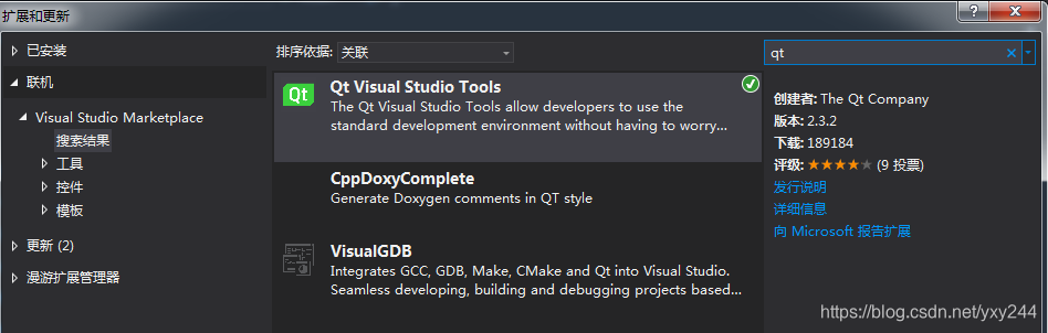 2.搜索框输入QT,在联机里搜索,选择QT Vsiual Studio Tools并安装(安装需要关闭VS,之后开始安装)