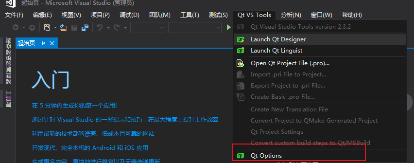 3.装好重新打开VS,菜单栏多出个QT VS Tools,点击QT Options