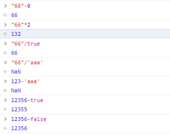( - * / %)这四个运算符,会将非数字的一方或双方进行隐式转换为数字 ,再进行运算,如果转换不成功,则显示为NaN