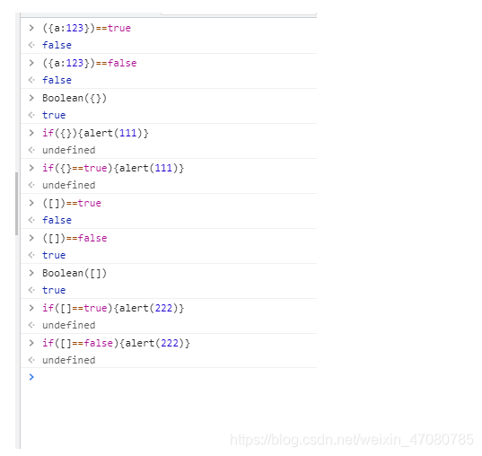 2. 而使用({ })==true 或者([ ])==true 可能会导致意想不到的错误,这两个会先调用valueOf( )后再进行比较。({ })调用valueOf()得到{ },或者说转换位数字不成功,([])调用valueOf()得到[ ],或者说转换数值成功为0,所以==false.