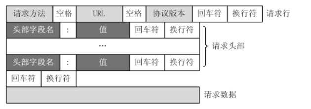 通过TCP套接字,客户端向Web服务器发送一个文本的请求报文,一个请求报文由请求行、请求头部、空行和请求数据4部分组成。